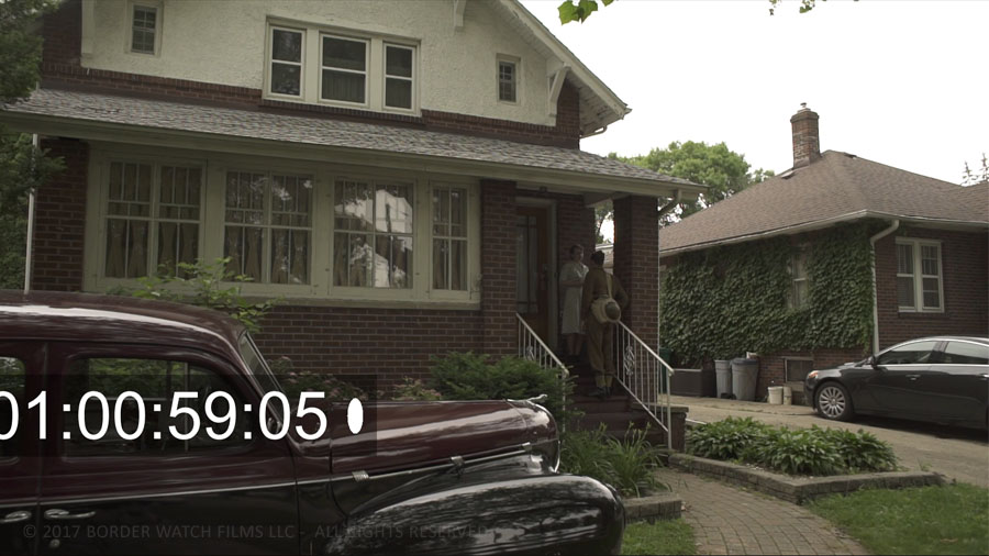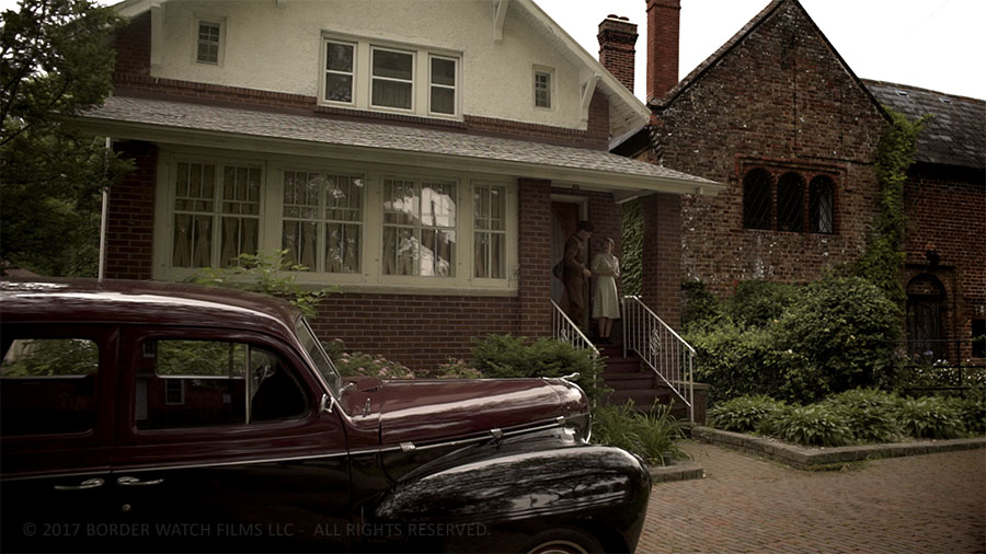 Thanks to Gabriel Everson’s compositing work, we didn’t have to choose between period scenery and good camera angle. Replacing the modern surroundings made the wide exterior shot possible (see below stills). He even moved the street onto the front yard for a more compact English look. But clouds were getting dark as we completed a second exterior take. It was going to rain any minute. The crew had to move fast for a third take and only barely returned the car to its garage in time. That third take is seen in the final film.
