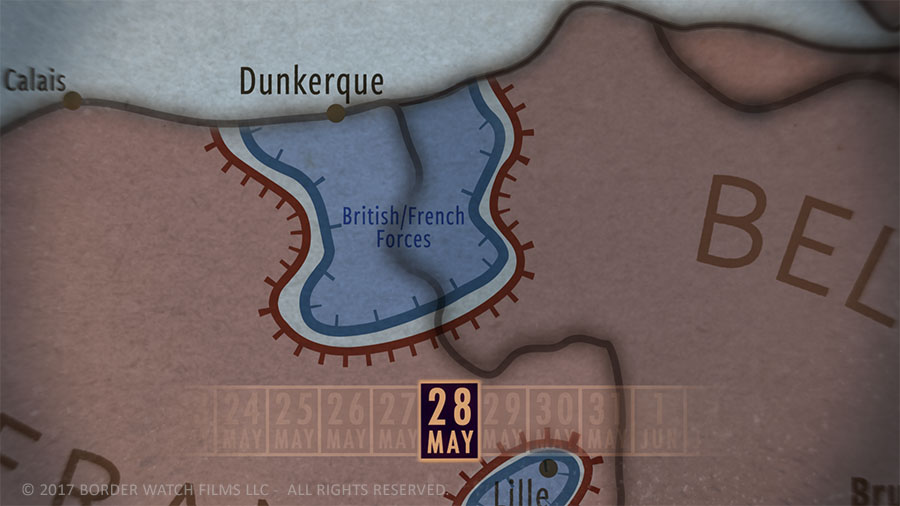 The animating of geographical maps proved difficult – especially for Johnathan Schutz who was trapped between a director and a stack of history references. The position of battle lines had to match a particular day and then animate forward to another day in a accurate way, which viewers could still process quickly on a screen without pausing to study details. This meant switchable layers to hide elements that aren’t always important to the topic and avoiding fine print elements. Sometimes the camera would need to move from one place to another. If that wasn’t enough to consider, we also had to find a 1940 political map, since the boundaries between nations and even names have changed some since that time. We had to study a variety of WWII and Dunkirk references to find correct positions and correct dates. Lastly, the director insisted on a certain artistic style being achieved. Although it was difficult, Johnathan created some very nice animations that have been widely appreciated by viewers.